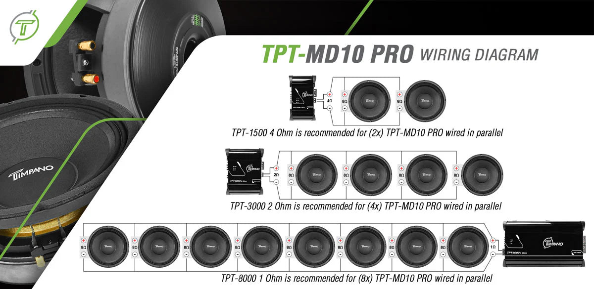 Designated at 8 Ohm impedance to work great with our high power amplifiers, where you can install multiple speakers on a single system amplifier, you can easily wire 8x speakers in parallel to a TPT-8000 at 1 Ohm or 4x speakers into a TPT-3000 at 2 Ohm, and even just 2x speakers into a TPT-1500 4 Ohm.